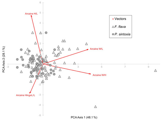 Principal components analysis (PCA) biplot for arcsine transformed shell height/length (H/L), width/length (W/L), width/height (W/H), and hinge length/length (HingeL/L) of F. flava and P. sintoxia specimens.