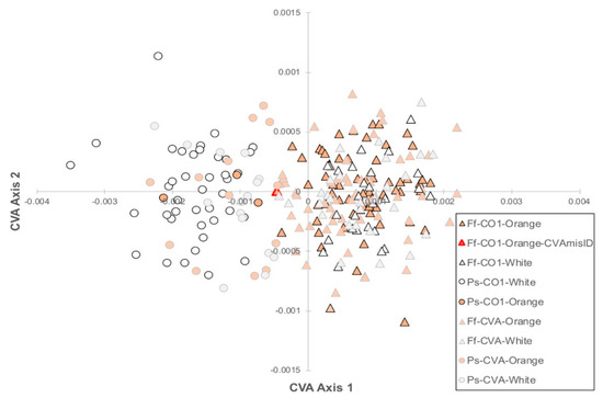 Canonical variates analysis (CVA) biplot of F. flava (Ff) and P. sintoxia (Ps) using 21 landmarks (Figure 1). In the legend, “CO1” refers to specimens that were sequenced at COI and used to build the CVA model and “CVA” refers to specimens were assigned to species using the CVA only (no COI sequence). Foot color is indicated using orange or white markers. Significant differences (p < 0.0001) in shell shape were found along axis 1.
