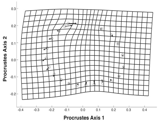 Procrustes deformation grid of shell shape showing differences in mean shell shape between P. sintoxia (circles) and F. flava (ends of vector arrows) along CVA Axis 1 (Figure 3).
