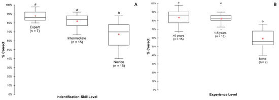 Box plots of scores showing mean, median, quartiles, and outliers, based on identification skill levels (A) and years of experience (B) in correctly identifying pigtoe mussels. Significant groupings from a Kruskal–Wallis and Dunn post-hoc test (p < 0.05) are shown as a and b.