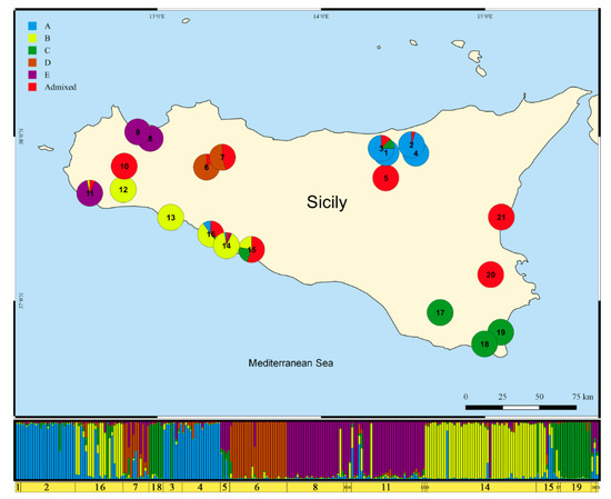 Figure 1. Genotypic structuring of 245 Sicilian pond turtles (Emys trinacris) from 21 sampling sites for K=5 using 16 microsatellite loci based on the STRUCTURE analysis. Distinct clusters are colour-coded; samples are arranged according to the numbers of the pooled sampling sites (Table S1). Within each cluster, an individual turtle is represented by a vertical segment that reflects its ancestry. Mixed ancestries are indicated by differently coloured sectors corresponding to inferred genetic percentages of the respective cluster. Colours of pooled sampling sites in the map correspond to STRUCTURE clusters; slices represent turtles with mixed ancestries or conflicting cluster assignment (percentages).