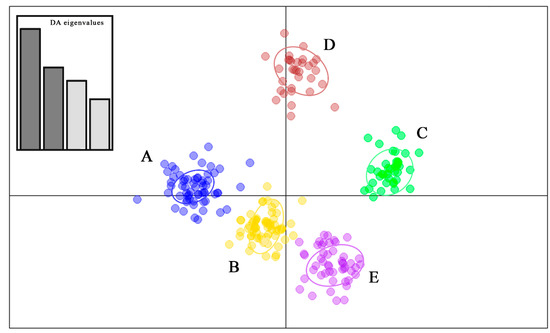 44. Jombart, T.; Devillard, S.; Balloux, F. Discriminant analysis of principal components: A new method for the analysis of genetically structured populations. BMC Genet. 2010, 11, 94. [Google Scholar] [CrossRef]
