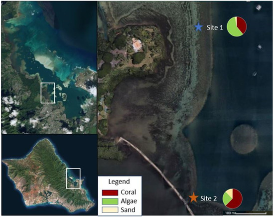 This research was conducted in Kāneʻohe Bay, Hawaiʻi (21.4° N, 157.8° W). A barrier reef separates the ocean from the inshore estuarine Bay system, which is characterized by numerous shallow patch reefs (<1 m depth) and a shallow fringing reef (0.3–0.9 m depth) ringing the majority of the shoreline [16]. Coral reefs in the Bay have one of the highest percentages of coral cover (54–68%) among 32 hard-bottom habitat monitoring sites with permanent transects at 3 and 10 m depths within the main Hawaiian Islands (Hawaii average = 24.1%) [14,15,26]. Site 1 (21.44300899° N, 157.80636° W) was located approximately 125 m offshore of Kealohi Point at Heʻeia State park. Site 2 (21.43853104° N, 157.806541° W) was located just 25 m away from the Paepae o Heʻeia (Heʻeia traditional Hawaiian fishpond), directly in front of a triple mākāhā (sluice gate) providing freshwater input. Both sites were located on the inshore edge of Malaukaʻa fringing reef (Figure 1).