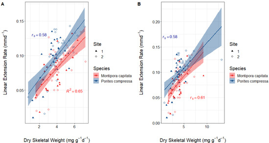 Correlations between dry skeletal weight and linear extension rates for both P. compressa and M. capitata (A) with the outliers removed and (B) with the outliers left in. (A) The data for M. capitata were normal; therefore, R2 (0.65, p < 0.0001) was calculated using Pearson’s correlation test. Linear extension rates for P. compressa were not normal; therefore, rs (0.58, p < 0.0001) was calculated using Spearman’s rank correlation test. (B) Dry skeletal weight was not normally distributed for M. capitata; therefore, Spearman’s rank correlation test was used (rs = 0.61, p < 0.0001). For P. compressa, neither dry skeletal weight nor linear extension rates were normal, so Spearman’s Rank correlation was also used (rs = 0.58, p < 0.0001). Symbols distinguish nubbins placed at the two destination sites.