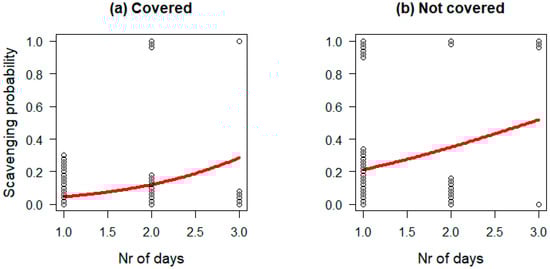 The logistic model explaining the probability of being scavenged selected by model reduction included number of days after the kill and treatment as explanatory variables. The probability of being scavenged increased with number of days since the kill was made, and when the kill was uncovered. The regression equation for covered carcasses was y = 0.03 + 0.69 * Nr of days, whereas the regression equation for not covered carcasses was y = 0.80 + 0.69 * Nr of days (p < 0.05 for all terms).