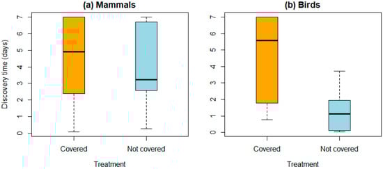 Box plots showing the effect of covering video-monitored experimentally-deployed roe deer carcasses on time to discovery (in days) for (a) mammalian, and (b) avian scavengers in South-Eastern Norway.