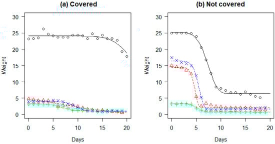 Daily weight variation (kg) and fitted Weibull curves describing the decay process of (a) five covered, and (b) five uncovered paired roe deer carcass or parts placed in a metal cage to exclude vertebrate scavengers during summer in South-Eastern Norway. The line in black in (a,b) are whole carcasses; the other lines are parts.