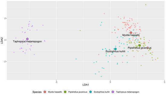 Plot of the linear discriminant functions LDA1 and LDA2 that separate echolocation calls of Taphozous melanopogon from those of the vespertilionid species.