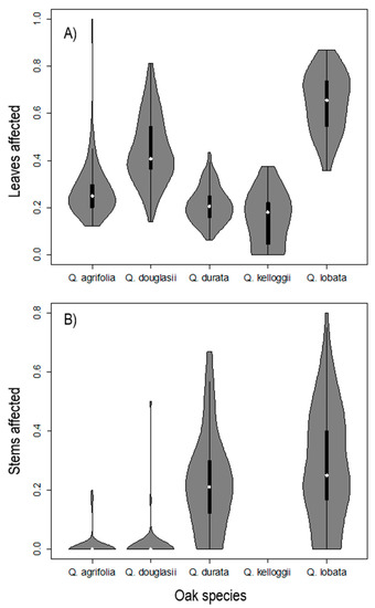 Violin plots showing the probability of gall incidence for leaves (A) and stems (B) of the five sympatric oak species at Jasper Ridge Biological Preserve, Northern California, USA. The violin plots show the median values of the data (white dot) with a box indicating the interquartile range and a rotated kernel density plot on each side.