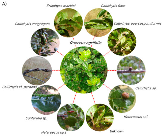As long known, cynipids radiated into the genus Quercus [72], and this is clearly observed in this survey at JRBP. Quercus spp. represents a superhost complex [73] for galling wasps and hence an important system to observe species formation and differential resistance/susceptibility to herbivory [71]. Interestingly, very few gall-inducing taxa were found outside the Cynipidae family, with the mite Eriophyes mackiei (Eriophyidae; Arachnida) as one of the most widespread gall inducing agents in the evergreen Q. agrifolia. Further studies should explore the diversity of gall-inducing taxa, including both types of generations as their galls and adult morphs can differ considerably in size, form, color, and seasonal occurrence from the corresponding generation [9,67]. As pointed by Evans [61], the generations are so different that their relationship becomes apparent only through careful rearing and field observation, or with the use of genetic analysis.