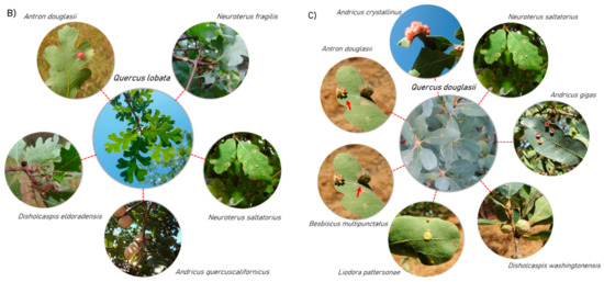 This part of the study focused on the three most abundant oaks: Q. agrifolia, Q. douglasii, and Q. lobata. Each of these oak species is host to several species of galling arthropods, including Eriophyes mackiei, Andricus crystallinus, and Antron douglasii, respectively, which were the most prominent galling species. The galling E. mackiei is a mite (Acarina: Eriophyidae) that causes blister-like swellings, which protrude from the upper leaf surface of its host plant [17] (Figure 1). The mites feed and reproduce within those blisters [17]. The host of E. mackiei, Q. agrifolia, is a drought-resistant monoecious evergreen tree of California [44], which inhabits the lower elevation oak woodlands. The galling insect Andricus crystallinus is characterized as a cynipid leaf gall (Hymenoptera: Cynipidae), which is found in virtually all California oak species [17]. It produces a gall of varying shades of pink and is densely covered with white, red, or brown hairs [45] (Figure 1). The galling insect A. douglasii is also a cynipid (Hymenoptera: Cynipidae) leaf gall [46]. Its gall is a star-shaped, red to purplish structure with blunted horns [46] (Figure 1). Like A. crystallinus, the larvae of A. douglasii matures within the gall and then emerges to complete the next generation, and its larvae does not grow until the gall structure is mature [17].