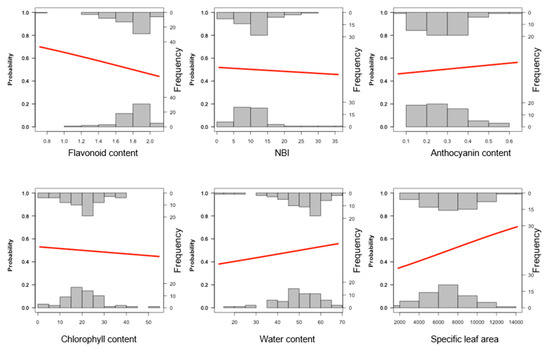 Fitted logistic regression curves showing the predicted probability of gall presence across the study physiological variables. The histograms represent the observed data (1 = galled leaf; 0 = ungalled leaf) and the line shows the predicted probability. n = 64 models.