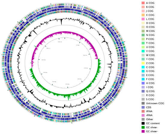 To investigate the potential functional capabilities of strain KSNA2T, whole-genome sequencing was performed using a combination of PacBio RSII and Illumina HiSeq X-ten sequencing platforms [8]. PacBio RSII produces long reads to facilitate de novo assembly of long repetitive sequences, but the required coverage is more costly to attain; conversely, the Illumina HiSeq X-ten produces short-read sequences, though the read length can limit assembly. However, this platform can handle lower quantity and quality genomic DNA than the PacBio RSII [16]. In our study, we combined both platforms to get high quantity and quality genome sequences. As described previously [8], the genome of strain KSNA2T comprises a single circular chromosome of 5,182,800 bp with a G + C content of 56.1%. The genome was predicted to contain 4679 protein-coding genes, 83 transfer RNA genes, 22 ribosomal RNA genes, 7 ncRNA genes, and 97 pseudogenes. A circular genome map was generated using the GC view program [17] (Figure 1).