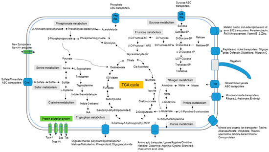 There were 4122 protein-coding genes connected to the Kyoto Encyclopedia of Genes and Genomes (KEGG) pathways. These were analyzed using Blast KOALA based on the KEGG pathway database and contained annotated genes in 123 metabolic pathways, including the TCA cycle, pentose-phosphate pathway, and galactose metabolism pathway. KSNA2T can utilize carbon sources such as pentose, fructose, galactose, and starch-sucrose. Metabolic genes, including those involved in the fatty acid, sulfur, nitrogen, biotin, vitamin B6, riboflavin, thiamin, and methane metabolic pathways, were present. In addition, 13 membrane transport and signal transduction pathways, including ABC transport, phosphotransferase system (PTS), bacterial secretion system, two-component system, mitogen-activated protein kinase (MAPK) signaling pathway-fly, MAPK signaling pathway-plant, MAPK signaling pathway–yeast, HIF-1 signaling pathway, FoxO signaling pathway, phosphatidylinositol signaling system, phospholipase D signaling pathway, PI3K-Akt signaling pathway, and 5′ adenosine monophosphate-activated protein kinase (AMPK) signaling pathway, were annotated. ABC-2 and other transporters, such as Na+ transporters (NatB and NatA), were also found. Database analyses, a simplified model of metabolism, and the important cellular components of J. calystegiae KSNA2T are provided (Figure 2).