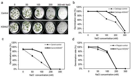 Seeds of cabbage, pepper, and carrot were used in this study. The seeds were surface sterilized with 1% (v/v) sodium hypochlorite in water for 10 min followed by rinsing 5 times in distilled water. The seeds were then soaked in a KSNA2T suspension (108 CFU/mL) or TSB (control) for 8 h. A total of 20 seeds were sown in Petri dishes (90 mm diameter) with two sheets of sterile filter paper (Advantech, Tokyo, Japan). The seeds were moistened either with distilled water (control) or with solutions of varying NaCl concentrations (50, 100, 200, and 300 mM) and kept at 25 °C. After 7 d, the emergence of the radicle from the seeds was considered indicative of germination. The germination percentage was calculated as follows: germination % = (number of seeds germinated/number of seeds sown) × 100. All experiments were performed in triplicate.