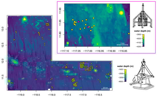 Bathymetric map of the German license area for the exploration of polymetallic nodules with the study area (magenta square) located in the eastern part of the area; points indicate sampling positions of boxcorer deployments (bottom left) and detailed bathymetric map of the study area; points indicate sampling positions of multicorer deployments (top right). Two time-series stations that were sampled in four different years (2013, 2014, 2016 and 2018) are marked in magenta.