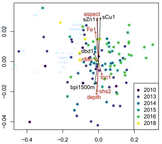 Non-metric multidimensional scaling of the Bray-Curtis Dissimilarity (stress: 0.02) computed for the meiofauna community on high taxonomic level regarding each core as one individual sample. The colours of the points indicate the year of sampling. Vectors correlate environmental variables to the community patterns; red arrows indicate high significance of the vector; black arrows indicate low significance. aspect: cardinal direction of the slope, BPI1500m: bathymetric position index across a radius of 1.5 km, dbd4: dry bulk density in 4 cm sediment depth, depth: water depth, nMo: content of molybdenum in polymetallic nodules, sCu1: content of copper in 1 cm sediment depth, sFe1: content of iron in 1 cm sediment depth, sZn1: content of zinc in 1 cm sediment depth, shs2: shear strength in 2 cm sediment depth, toc1: total organic carbon in 1 cm sediment depth.
