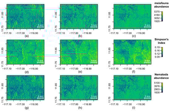 Distribution maps based on random forest regression using backscatter and bathymetry only (left), all available predictors (middle) and sediment and nodule parameters only (right) as predictor variables. Maps show overall meiofauna abundance (a–c), Simpson’s Index on high taxonomic level (d–f) and abundance of Nematoda (g–i).