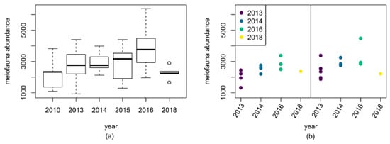 Boxplot of overall meiofauna abundance per 100 cm2 of sediment in different years, with the middle line being the median, the box referring to the first and third quartile and the whiskers indicating maxima and minima within a 1.5-fold interquartile range; potential outliers are indicated by points (a); overall abundance of meiofauna per 100 cm2 in samples obtained in consecutive years from the two time-series sample sites (see magenta dots in Figure 1: left: northwestern station; right: southeastern station) (b).