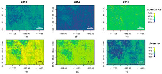 Diversity is predicted to be generally lower in 2016 (Figure 5f). However, in 2016, spatial patterns are almost identical to spatial predictions computed with all available samples (Figure 5f). In 2014, the same pattern can be observed, although higher peaks in diversity occur in the west (Figure 5d). These spots of higher diversity are even more pronounced in 2013 (Figure 5e).