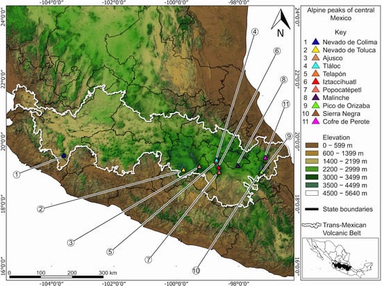 - Almeida-Leñero, L.; Escamilla, M.; De Azcárate, J.G.; González-Trápaga, A.; Cleef, A.M. Vegetación alpina de los volcanes Popocatépetl, Iztaccíhuatl y Nevado de Toluca. In Biodiversidad de la Faja Volcánica Transmexicana; Luna, I., Morrone, J.J., Espinosa, D., Eds.; FES-Zaragoza-CONABIO: México City, Mexico, 2007; pp. 179–198. [Google Scholar]