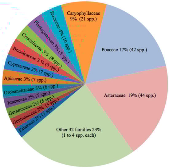 Between 2012 and 2018, approximately 1500 collections were made, many of these with one to several duplicates. An additional 2200 previously collected herbarium specimens were examined, primarily from ENCB, MEXU, and MSC, and nearly 450 observations on iNaturalist were also reviewed. We document 46 families, 130 genera, and 237 species of vascular plants (Table A1). More detailed information about distribution, collectors, vouchers from the different volcanoes (including herbarium) and in some cases synonyms, ecological preference and/or conservation status can be consulted in the Supplementary Material. Some representative species are depicted in Figure 3. The ferns consist of five families, 11 genera, and 12 species, whereas there are two families, three genera, and three species of gymnosperms. The remaining 39 families, 116 genera, and 222 species are angiosperms. The most diverse families are Asteraceae (44 spp.), Poaceae (42), and Caryophyllaceae (21) (see Figure 4). The most speciose genera are Muhlenbergia (8), Cerastium (8, including one introduced), Senecio (7, one introduced), Arenaria (7), Poa (7, two introduced), and Carex (6). The remaining genera are all represented by five species or fewer, and 19 families and 85 genera have a single species in the region. One family, six genera, and 12 species are introduced.