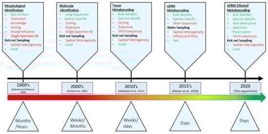 One of the most common methods of sampling macroinvertebrates to determine community distribution and diversity is kick-net sampling (Figure 1), followed by sample sorting and identification []. However, the morphological identification of organisms associated with kick-net sampling often leads to misidentification due to the lack of diagnostic characteristics in some organisms, such as intermediate larval stages or damaged specimens [,]. Furthermore, this method is time-consuming and costly [,]. Taxonomic challenges such as these have encouraged technological innovations involving molecular identification (e.g., DNA barcoding, []). DNA barcoding involves using sequences of DNA from specific genes to identify organisms. For animals, this is often the cytochrome c oxidase I (COI) gene []. DNA barcoding is an efficient and accurate method to identify taxa relevant to biomonitoring programs and can yield higher species richness estimates compared to morphological identification [].