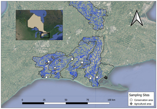 The lack of local effects may be a result of the large-scale agricultural land use within the Lake Erie watershed. Previous studies observing an agricultural gradient in Southern Ontario suggested that macroinvertebrate communities in these streams may be relatively homogenous due to intense agriculture within the watershed [,]. Water quality results in this study were influenced by the percentage of agricultural land use rather than site type. Southwestern Ontario is a very developed area of the province and the impacts of agriculture have been observed for a long time []. Therefore, all streams in our study area, including those in conservation areas, can be influenced by agriculture in the watershed. Thus, lumping sites into categories based on the immediate surrounding landscape (e.g., conservation area or farm) is potentially not the best reflection of agricultural impact. This suggests that a more robust look at regional land-use composition is required to create a more representative gradient. We did detect differences in water quality parameters that were related to the percentage of agricultural land use in the catchment, thus a more accurate reflection of land use might be to include the percentage of cropping in the regional catchment, rather than a binary category of local impacts (e.g., some conservation areas are small and surrounded by farms upstream).