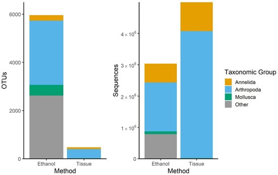 The number of OTUs and total sequences made up by the target taxa (Annelida, Arthropoda, Mollusca) for both ethanol and tissue samples.
