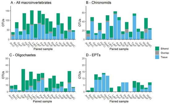 Each bar represents a paired sample (a bulk tissue sample and the associated ethanol eDNA sample from its preservative) for (A) all macroinvertebrates, (B) chironomids, (C) oligochates, and (D) EPTs. OTUs unique to the tissue sample are represented by a blue bar and those unique to the ethanol sample are represented by a green bar. The number of OTUs shared between a paired tissue and ethanol sample are represented by a grey bar in the middle of a column. The absence of a grey middle bar indicates that no OTUs were shared.