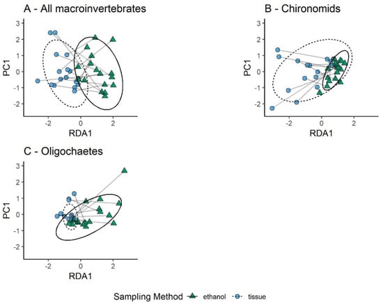 The redundancy analysis plots for (A) all macroinvertebrates, (B) chironomids, and (C) oligochaetes. Tissue samples are represented by blue circles and ethanol samples are represented by green triangles, each with 90% confidence ellipses. Paired samples (e.g., the ethanol preservative from its associated bulk tissue sample) are joined by a grey line. EPTs are not represented here as tissue and ethanol sampling did not share any EPT OTUs.