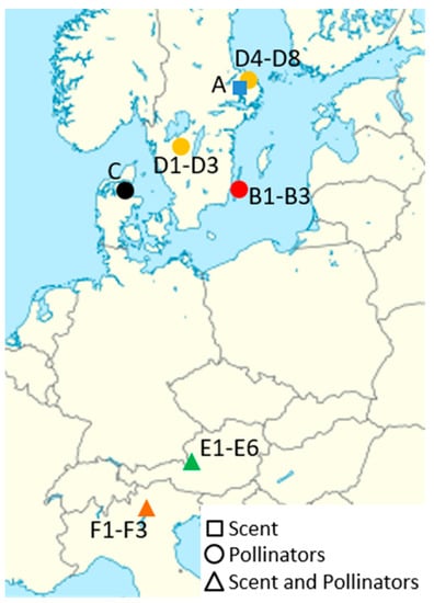 Regions and study sites at different latitudes in Europe, where data on pollinators (circles), scents (squares), or both (triangles) were collected in the present study or available from literature. Data included in the present study were from Scandinavia ((A) Bergström et al. [18]; (B) Nilsson [21]; (C) Erneberg and Holm [23]; (D) Antonelli et al. [22]), the Northern Alps ((E) Braunschmid et al. [12] and this study), and the Southern Alps ((F) this study). With the exception of A and C, where a single population was sampled, three to six populations were sampled per study area.