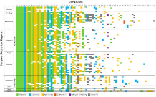 Visualization of presence/absence of all scent compounds in all samples. The scent compounds are numbered on the x–axes (first line) according to numbers in Table 1. Lines on the y–axes represent the samples, with denotation of their populations and regions of origin. The colors represent compound classes. Data from the Northern Alps (except populations Annaberg and Taugl) were from Braunschmid et al. [12], those from Uppsala (Scandinavia) from Bergström et al. [18].