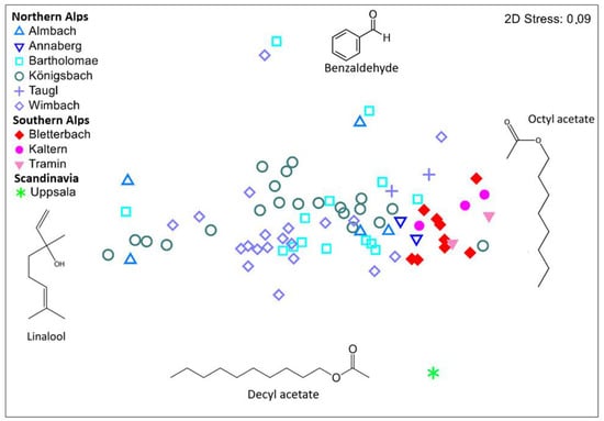 Non-metric multidimensional scaling (NMDS) were used to visualize semi-quantitative similarities among the single scent samples collected from overall ten different populations in the Southern and Northern Alps, and in Uppsala, Scandinavia. All dots represent single scent samples, with the exception of the Uppsala-data point, which represents the mean of three samples (see Methods). This ordination is based on pairwise Bray–Curtis similarities. Compounds most responsible for ordination of samples as indicated by a SIMPER analysis are also plotted. Data from the Northern Alps (except populations Annaberg and Taugl) were from Braunschmid et al. [12], those from Uppsala, Scandinavia from Bergström et al. [18], and all others were collected for the present study.