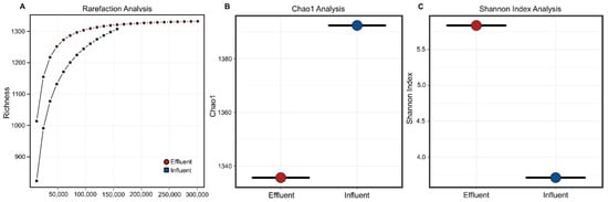 Diversity analysis of the domestic sewage metagenomes sequence reads. (A) Rarefaction analysis of influent and effluent samples, (B) chao1 index, and (C) Shannon diversity index.