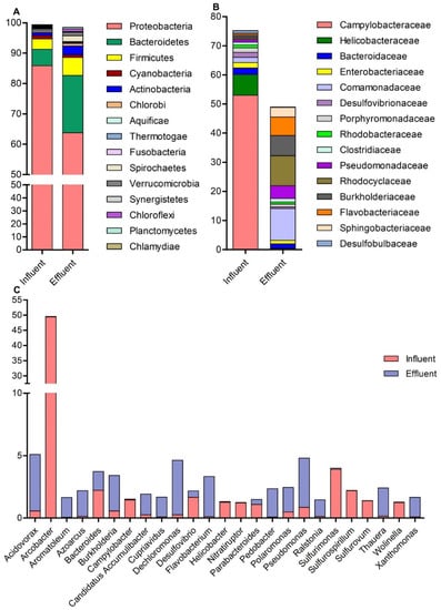 Taxonomic analysis of bacterial communities in the influent and effluent metagenomes. Percent abundance of the relatively dominant (A) phyla, (B) families, and (C) genera. The x-axis shows taxa, and the y-axis indicates abundance in percentage. The relative abundance was calculated by normalizing the sequence reads of each bacteria taxon to the total number of bacteria associated sequences reads in the respective metagenome.