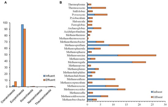 Archaea were identified as having the same relative abundance (0.6%) in the metagenomes of both samples, but variations were noted in the distribution of taxa and their abundance between influent and effluent. The archaeal sequence reads were dominantly aligned to Euryarchaeota (≥90%) in both samples, whereas Crenarchaeota increased to 8.0% in effluent from 2.1% in influent (Figure 3A). Similarly, Qin et al. reported that Euryarchaeota was dominant, followed by Crenarchaeota in samples from WWTPs [46]. The archaea community included 20 methanogenic genera that overall represented 85.3% of archaea-associated sequence reads in influent and 60.2% in effluent; they were taxonomically classified mainly to Methanoregula, Methanosarcina, Methanococcoides, Methanospirillum, Methanococcus, Methanoculleus, and Methanocaldococcus (Figure 3B). In addition, the presence of methanogenic archaea, including genera of Thermococcus, Pyrococcus, and Archaeoglobus, was identified with more than 1% abundance in both influent and effluent metagenomes (Figure 3B). Methanogens are the most diverse groups of archaea and the focus of research because of their substantial contribution to methane emissions globally, as well as their role in wastewater treatment. Previously, families of Methanosaetaceae and Methanosarcinaceae were reported to be the predominant archaeal methanogens among the archaeal population in WWTSs [14]. These finding showed that archaea participate in the biodegradation process [46].