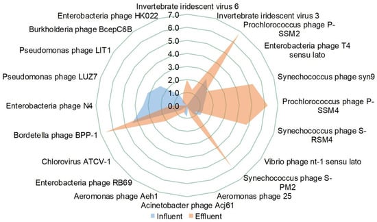 Bacteria are the main microorganisms in wastewater, and bacteriophages regulate the microbial community composition in wastewater system [47]. In the current study, the viromes was analyzed based on the metagenomes using the RefSeq database. Only 0.3% sequence reads in influent and 0.6% in effluent were related to viral genotypes, and they were taxonomically classified into 10 families. Around 5% of identified viruses could not be classified to existing viral families. The most frequent families of viruses found were Myoviridae (influent = 32.9%, effluent = 43.9%), Siphoviridae (influent = 32.3%, effluent = 25.6%), and Podoviridae (influent = 25.9%, effluent = 20.5%). These families include bacteriophage viruses and accounted for ≥90% of the virus sequence reads. Among the 76 Myoviridae-associated phages, Burkholderia, Prochlorococcus, Enterobacteria, and Synechococcus phages were detected at relatively higher abundances (Figure 4). From Siphoviridae, 105 phages were detected, including Pseudomonas, Flavobacterium, Stenotrophomonas, and Mycobacterium phages, whereas Podoviridae was represented by 58 phages, including Bordetella, Enterobacteria, and Pseudomonas phages, which were relatively more abundant (Figure 4). Families of Poxviridae and Adenoviridae that include potential human pathogens were identified at ≤0.1% abundance in both types of samples. The lytic ssDNA viruses’ family Microviridae was identified uniquely in effluent (0.3%). Inconsistencies have been observed with regard to the abundance of viruses in wastewater systems. For example, in metagenomic detection of pathogens from a sewage treatment plant, Giwa et al. identified viruses at a relatively high abundance of 7% in the effluent [26]. In contrast, another study retrieved a minute concentration of viruses in wastewater [48]. Bacteriophages have been identified as the predominant members of the viral microbiomes studied [26,49]. They influence microbial communities through interactions with their specific bacterial hosts. We found that bacteriophages dominate virus-associated sequences in sewage metagenomes [49]. Metagenomic analysis in this study does not represent a complete profile of viruses’ biodiversity and is considered a limitation of this study. Since total genomic DNA extracted from pellets of the centrifuged samples were used for shotgun sequencing. No viruses’ specific protocols were adopted to get complete coverage of DNA and RNA viruses in the studied samples. However, the finding of this study is consistent with previous studies that reported bacteriophages predominantly in the wastewater samples [26].