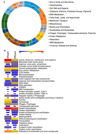 A significant proportion of both metagenomes was associated with housekeeping functions. The genes for amino acids and derivatives, protein metabolism, carbohydrates, nucleosides and nucleotides, respiration, cell wall and capsule, cofactors, vitamins, prosthetic groups, pigments, virulence, disease, and defense were present at relatively high abundance (3.4–12.9%) in both samples (Figure 5A). SEED subsystem classification suggested that pathways related to resistance to antibiotics and toxic compounds, gram-negative cell wall components, flagellar motility in prokaryotes, and inorganic sulfur assimilation were higher in influent compared to effluent sample (Figure 5B). Genes for RNA processing and modification, DNA repair, protein degradation, and capsular and extracellular polysaccharides were present at relatively higher abundance in effluent than influent (Figure 5B). The results from this study are consistent with the reported occurrence of a large core of genes in wastewater that are essential for microbial cellular and community functions [7,28].