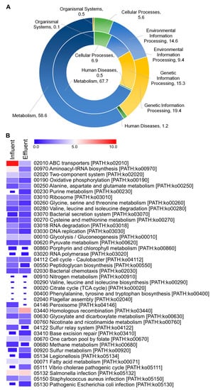 Similarly, in the KO database, metabolism-associated genes were found with more than 50% relative abundance, followed by genes related to genetic information processing, environmental information processing, and cellular processes (Figure 6A). Further analysis at the subcategory level revealed that pathways for alanine, aspartate, and glutamate metabolism [PATH:ko00250] and the cysteine and methionine metabolism [PATH:ko00270] were detected at a relatively higher abundance in influent (9.4% and 5.3%) compared with effluent (3.5% and 2.2%), respectively (Figure 6B). ABC transporters [PATH:ko02010] and bacterial secretion system [PATH:ko03070] pathways from the membrane transport category were identified at relatively higher abundance in effluent (6.6% and 2.2%) compared with influent (3.2% and 1.7%), respectively (Figure 6B). The genes related to pathways for glycolysis/gluconeogenesis [PATH:ko00010], bacterial chemotaxis [PATH:ko02030], flagellar assembly [PATH:ko02040], peptidoglycan biosynthesis [PATH:ko00550], and nitrogen metabolism [PATH:ko00910] were also detected at a relative abundance of ≥1% in both samples (Figure 6B). Previous metagenomic studies have also reported high proportions of these genes in wastewater. These genes are responsible for essential metabolic activities in microbial communities and are necessary in WWTSs [28]. In agreement with our findings, Sidhu et al. reported variation in the pre- and post-treated sewage [50]. They found genes for motility, DNA repair, protein metabolism, and respiration at significantly higher abundance in pretreated sewage, and genes related to amino acids and their derivatives, carbohydrate metabolism, fatty acids, and lipid metabolism were dominant in treated sewage samples [50].