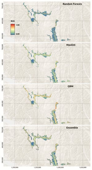 Relative index of occurrence (RIO) maps for western rattlesnakes (Crotalus oreganus) in British Columbia, generated for the model platforms Random Forests, MaxEnt, Generalized Boosting Models (GBMs) and the Ensemble model. Polygons show five geographic regions (Figure 1a,b). The closer the RIO values are to 1, the higher the probability of occurrence of the species. Note the scale is in meters.