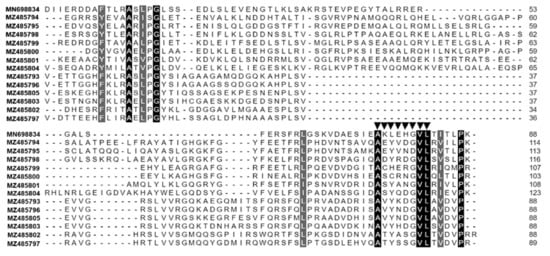 Sequences comparison and homologous analysis were conducted with the 13 sHsp entries obtained in current study and one sHsp gene containing complete coding region from dinoflagellate Scrippsiella trochoidea (GenBank accession: MN698834; [22]). All the 14 members consisted of a solely characteristic ACD flanked by variable N- and C-terminal extensions. The ACDs covered 88–123 amino acid residues with the typical A-X-X-X-N-G-V-L motif (Figure 1). The N- and C-terminal extensions were highly variable both in length and amino acid sequence. An average amino acid identities of about 26.7% was detected among 14 sHsp members from dinoflagellate species (Supplementary Table S2). Two entries coding for Hsp18.1 (MZ485796) and Hsp16.0 (MZ485793) exhibited the highest similarity of 79.5%. Merely 12.5% similarity was found between MZ485803 coding for Hsp22.3 and MZ485800 coding for a sHsp protein with predicted molecular mass of 17.7 kDa.