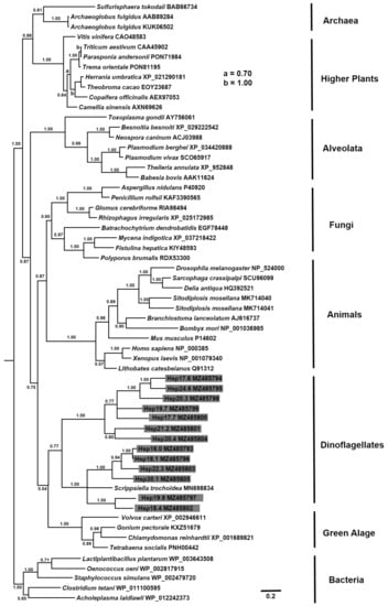 The following are available online at https://www.mdpi.com/article/10.3390/d13100471/s1, Table S1. Details for the sHsp sequences used in the phylogenetic analysis. Table S2. Amino acid similarities among 14 sHsps with complete coding region from dinoflagellates.