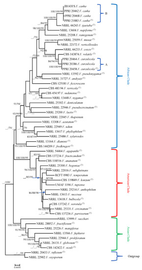 Species belonging to the FFSC group into three distinct clades, namely, the African, American and Asian clades [14,15,16]. The American clade represents most of the species in the FFSC [3], followed closely by the African clade [4,11,17]. The geographic topology of the species complex is thought to reflect the evolutionary origins of the hosts for the various species from these three continental areas, although the pattern is not always followed closely [14]. For example, F. verticillioides belongs to the African clade in the FFSC, but its maize and teosinte (wild Zea spp.) hosts are believed to originate from Mexico or Central America [11,18].