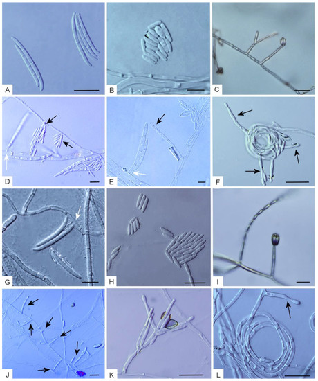 (A–F) Morphological characters of Fusarium casha on carnation leave agar (CLA). (A) Macroconidia. (B) Microconidia. (C) Microconidia produced in false heads. (D,E) Conidiogenous cells forming micro- and macroconidia (conidiogenous cells forming macroconidia indicated in white arrows). (F) Substrate hyphae bearing conidiogenous cells coiling into circles. (G–L) Morphological characters of F. curculicola on CLA. (G) Macroconidia (conidiogenous cell indicated with a white arrow). (H) Microconidia. (I) Microconidia produced in a false head (right) and a chain (left). (J) Conidiogenous cells (arrows). (K) A conidiophore. (L) Hyphae bearing a conidiogenous cell coiling into circles. Bars: 10 µm.