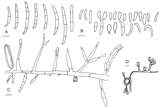Line drawings of morphological characters of Fusarium curculicola. (A) Macroconidia. (B) Microconidia. (C) Conidiophores and conidiogenous cells. (D) Conidia produced in false heads and hyphae coiling in circles. Bars: 5 µm.