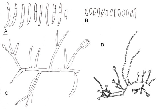 Line drawings of morphological characters of Fusarium casha. (A) Macroconidia. (B) Microconidia. (C) Conidiophores and conidiogenous cells. (D) Conidia produced in false heads and hyphae coiling in circles. Bars: 5 µm.