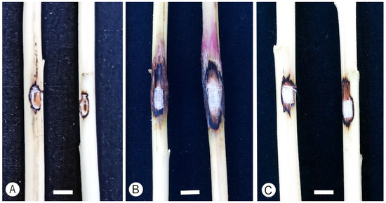 Lesions produced on Amaranthus cruentus in pathogenicity trials. (A) Control. (B) Inoculations with Fusarium casha (PPRI 21883). (C) Inoculation with F. curculicola (PPRI 20458). Bars: 5 mm.