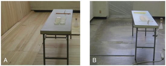 The appearance of the two rooms where the experiments were conducted. These two rooms were adjacent on the first floor of Owase City Hall, Japan. (A) a room containing timbers from Hinoki cypress on the floor and walls (experimental group); (B) a room without Hinoki cypress material (control group).