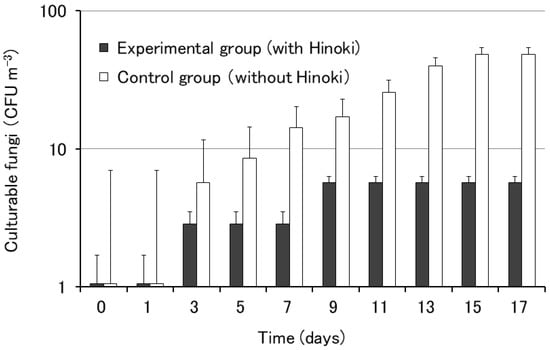 Growth of airborne fungi on potato dextrose agar with and without Hinoki. Each bar represents the mean of five agar plates. The error bars indicate standard errors.
